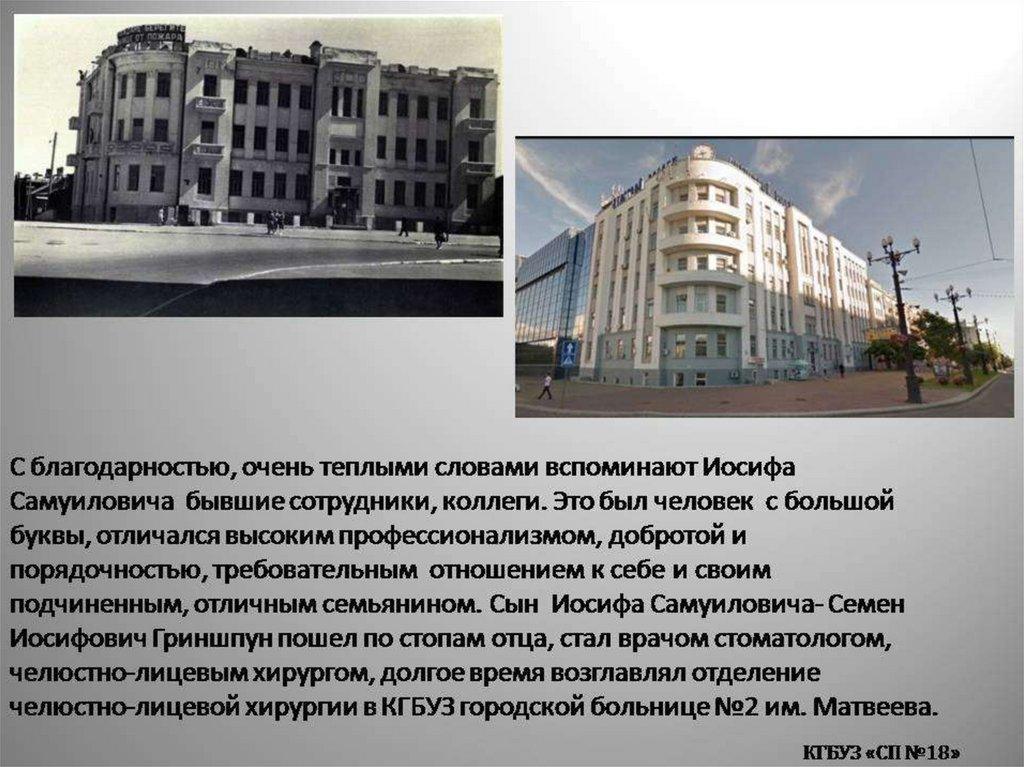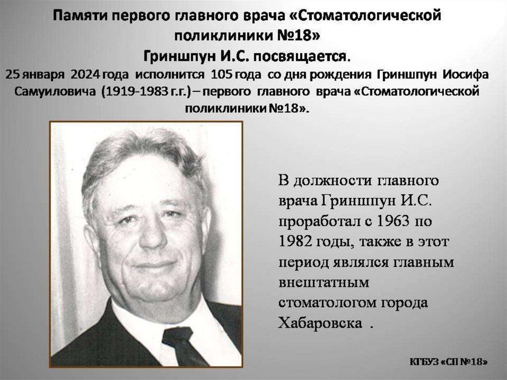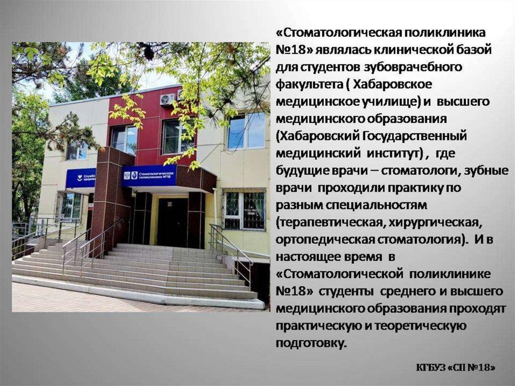 Первого сентября 1963 года при городской больнице № 11 было открыто стоматологическое отделение. Этот день коллектив стоматологической поликлиники № 18 считает датой своего рождения. Возглавлял отделение в течение 29 лет известный в крае специалист Иосиф Самуилович Гриншпун. Отделение размещалось в помещении на ул. Аксенова, 24, в двух врачебных кабинетах и зуботехнической лаборатории. В штате отделения состояли 28 специалистов, в том числе три врача-терапевта и ортопед-хирург. Врачи принимали до 30 пациентов в смену.