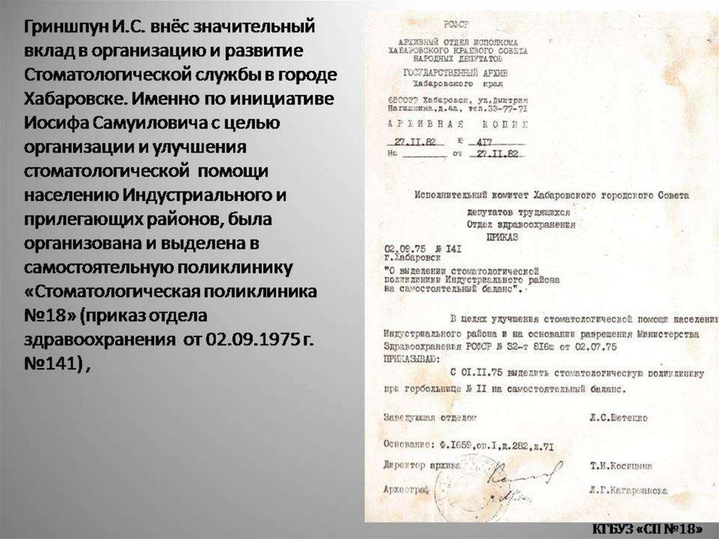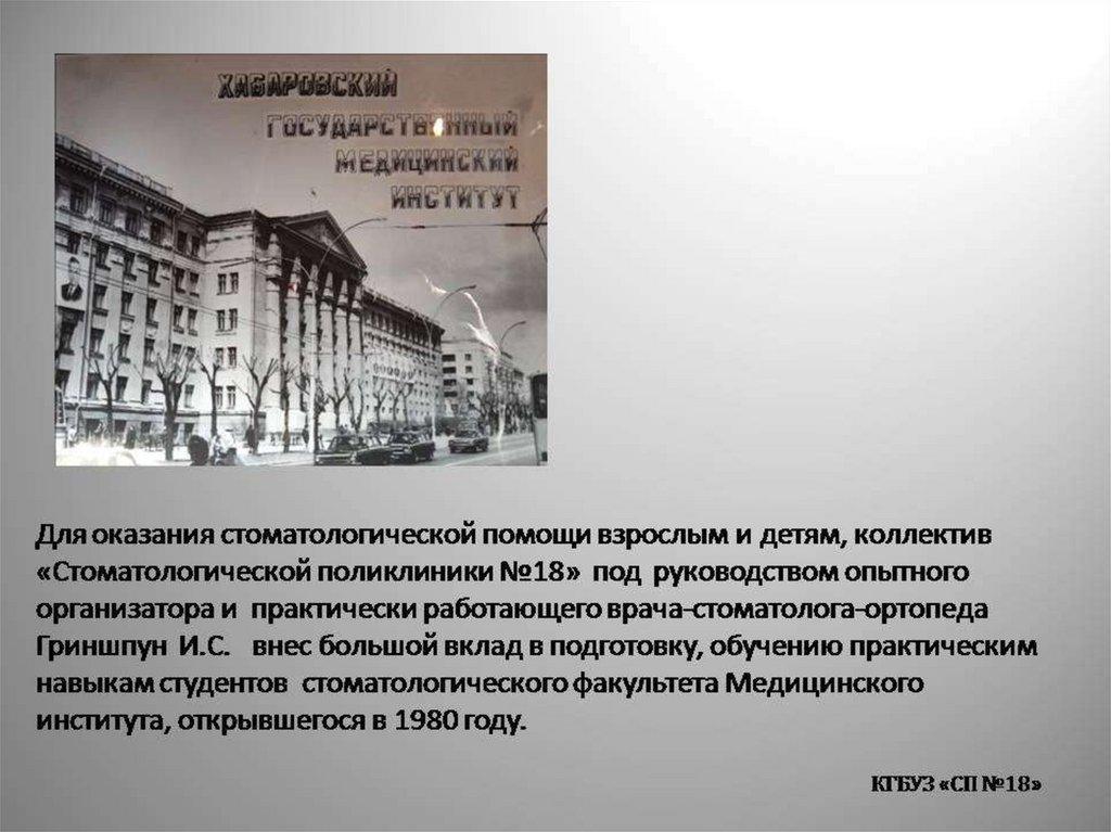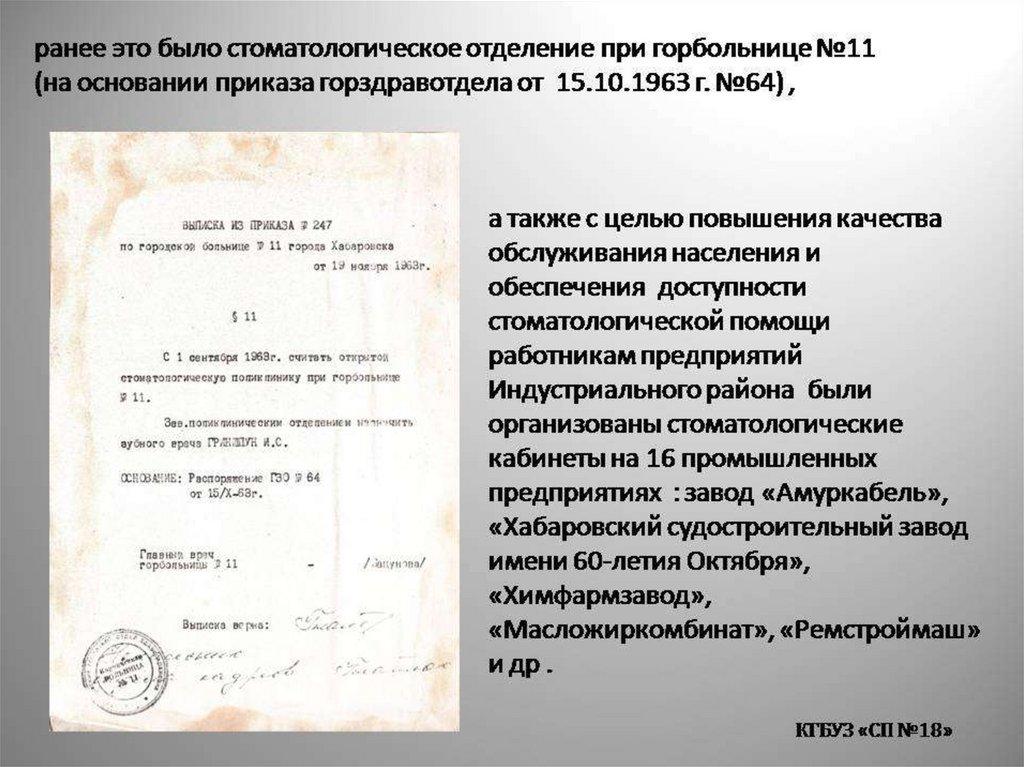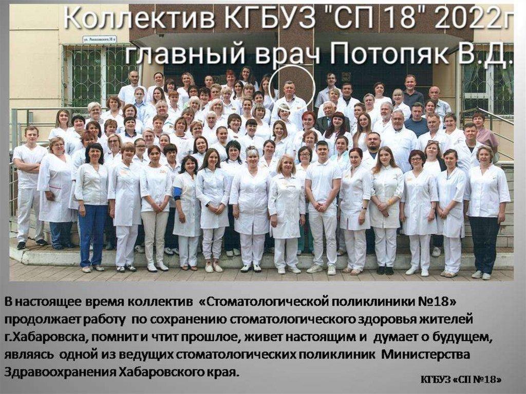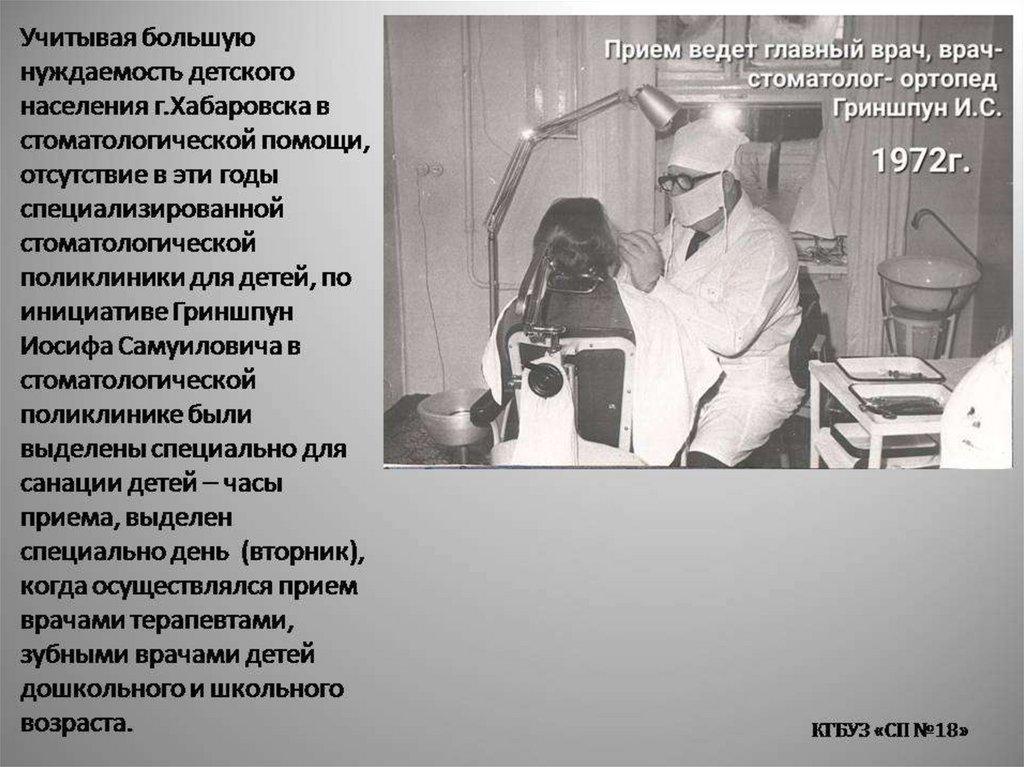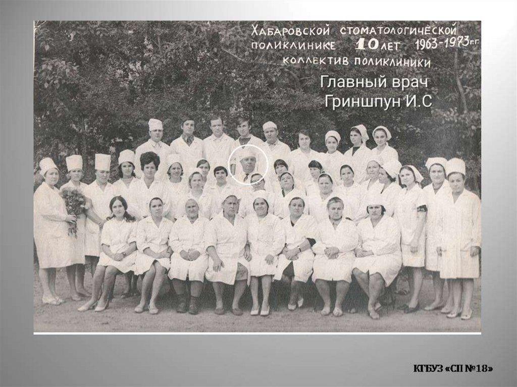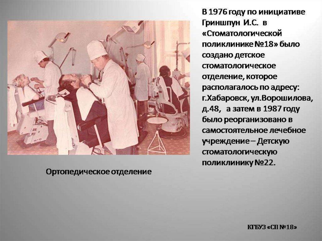 Позже детское отделение поликлиники стало самостоятельным лечебным учреждением — в Индустриальном районе г.Хабаровска появилась детская стоматологическая поликлиника № 22, которую возглавила В.М. Павленко.