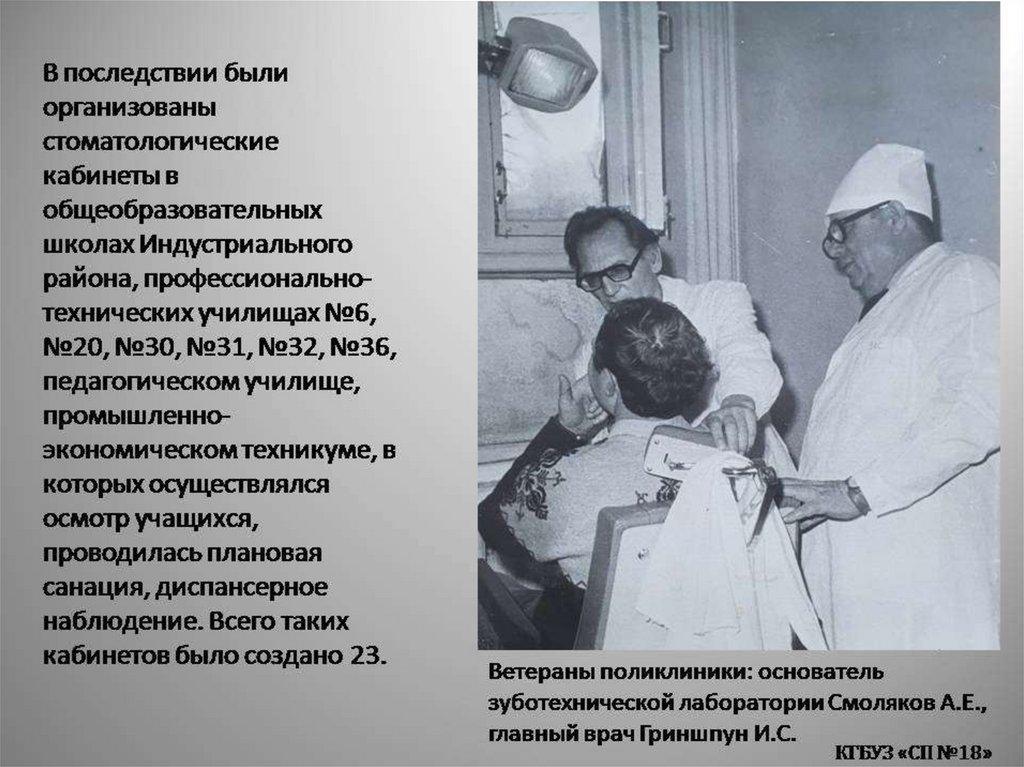 В 23 общеобразовательных школах района были созданы стоматологические кабинеты, где проводились профилактические осмотры и лечение пациентов. В трех школах внедрена система стоматологической диспансеризации.